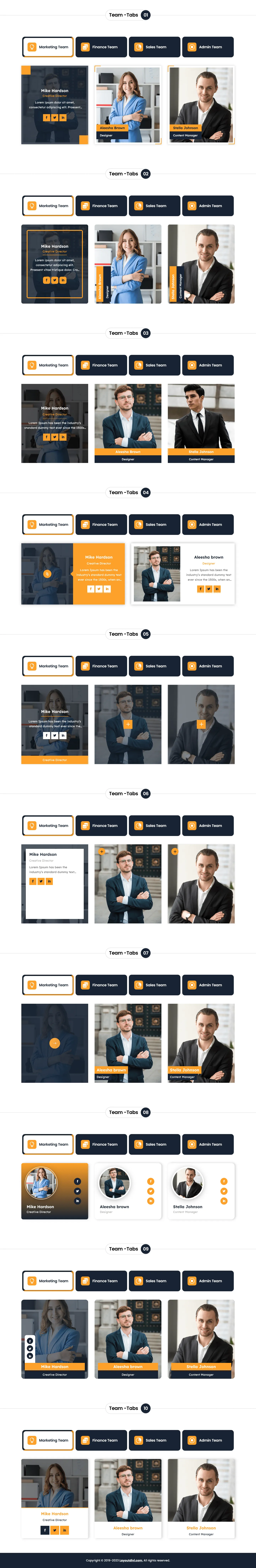 - Tabbed Layouts: Organize team profiles into clickable tabs for better navigation.
