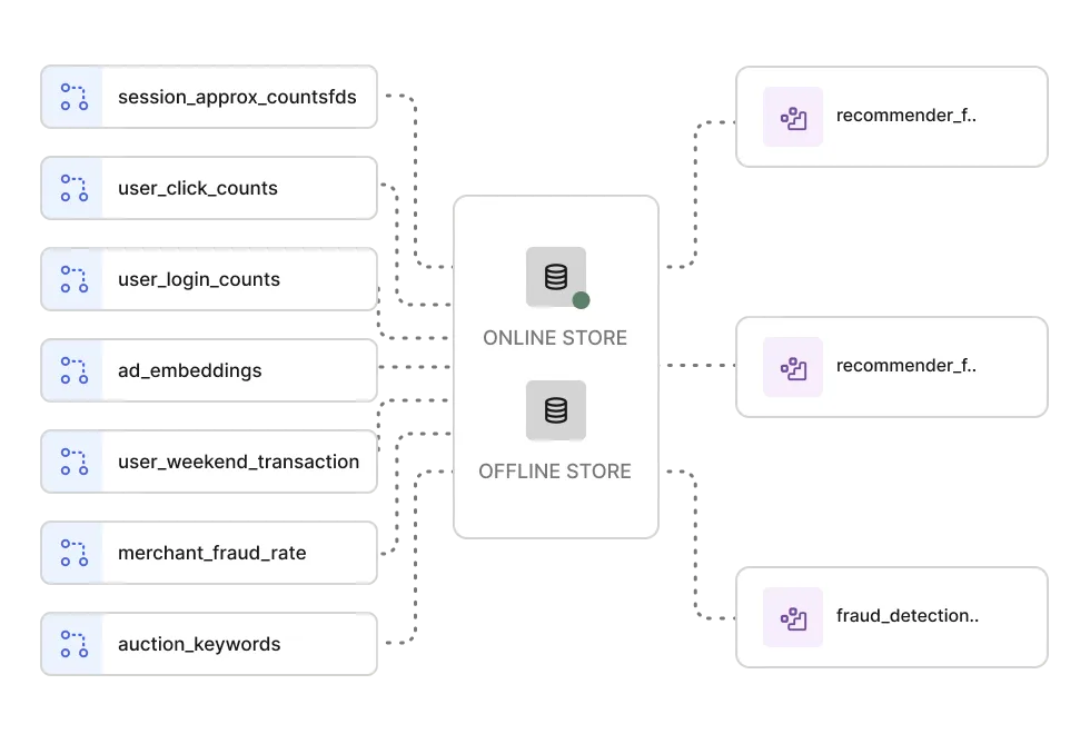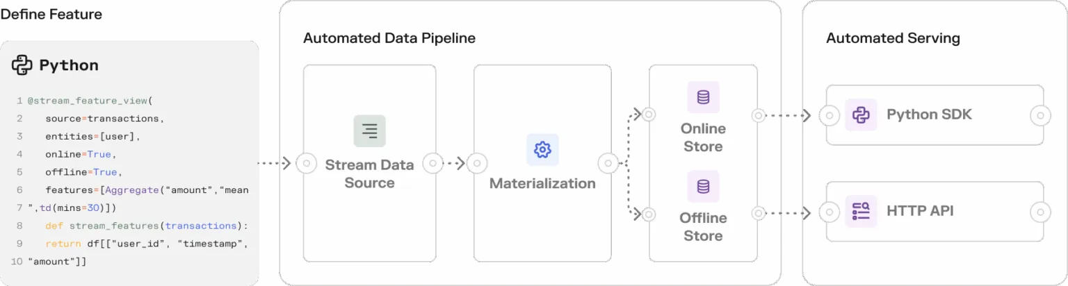 - Real-Time & Batch Support: Serve features instantly or precompute with support for Spark, Snowflake, and Tecton engines.