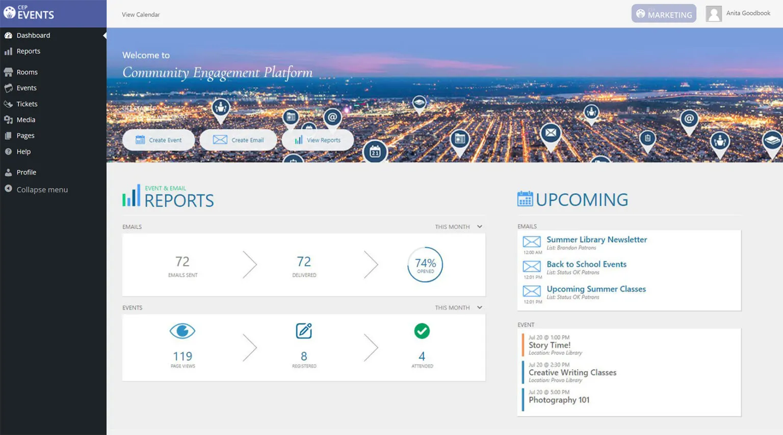Cloud-based platform for libraries to manage marketing, event programming, and targeted communications using integrated patron data.