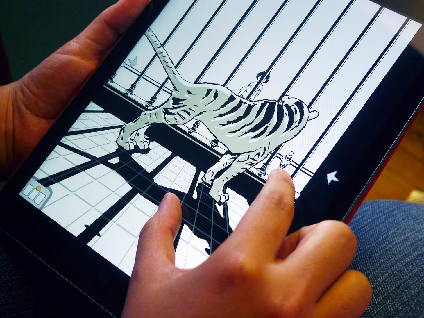 The Other Side by Mental Canvas is a three-dimensional interactive book experience based on Istvan Banyai’s illustrations. Designed for iPad, it invites users to flip, zoom, tilt, and drag through scenes, revealing clever shifts in perspective. It encourages discovery, perception, and visual exploration for all ages.