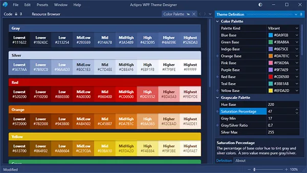 - **Helpful Brushes: **While each theme contains a number of brushes designed for specific controls like Button and ListBox, brush assets are also included for the entire generated color palette, various container level backgrounds / borders / foregrounds, and more.