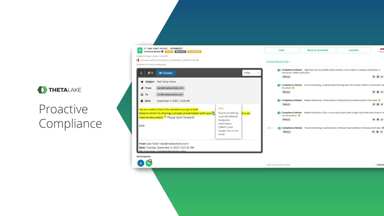 Theta Lake Proactive Compliance is a digital communications governance solution designed to supervise, surveil, and remediate conduct, compliance, and data protection risks across unified communications. The solution addresses common supervision challenges—poor data quality, incomplete records, delayed capture, and fragmented detection—by unifying capture across voice, video, chat, and other modalities and reconciling records for complete context. It applies built-in and custom machine learning classifiers to detect regulatory and policy violations, prioritizes and routes items to reviewer workflows, and provides explainable audit reporting for regulatory evidence.