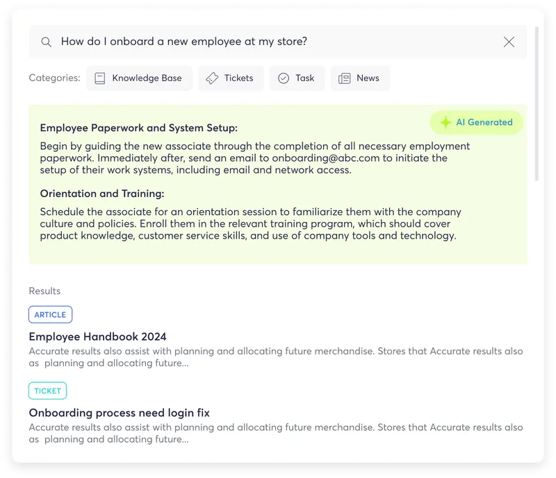 - Knowledge Base Integration: Pulls insights from articles, help tickets, and internal resources.