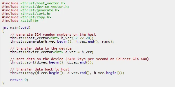 - STL-Like Templated Interfaces: Thrust provides STL-like templated interfaces to several algorithms and data structures designed for high-performance heterogeneous parallel computing.
