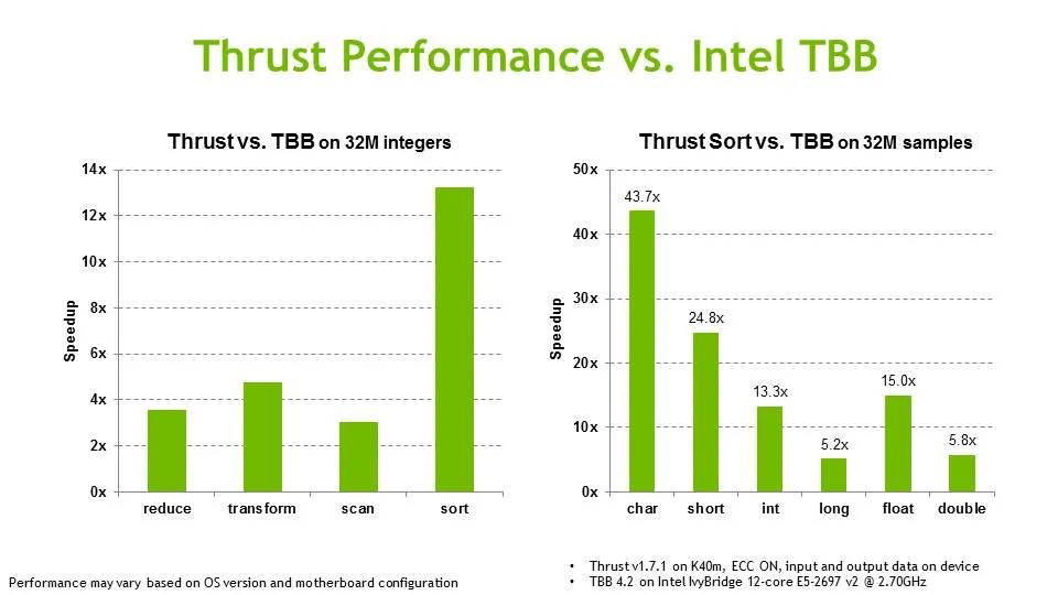 - High Performance: The thrust::sort algorithm delivers 5x to 100x faster sorting performance than STL and TBB.