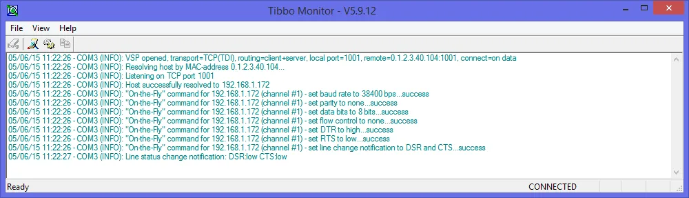 The Monitor logs all activity of Virtual Serial Ports on your PC. It is an indispensable tool for troubleshooting communications problems between your Virtual COMs and Device Servers.