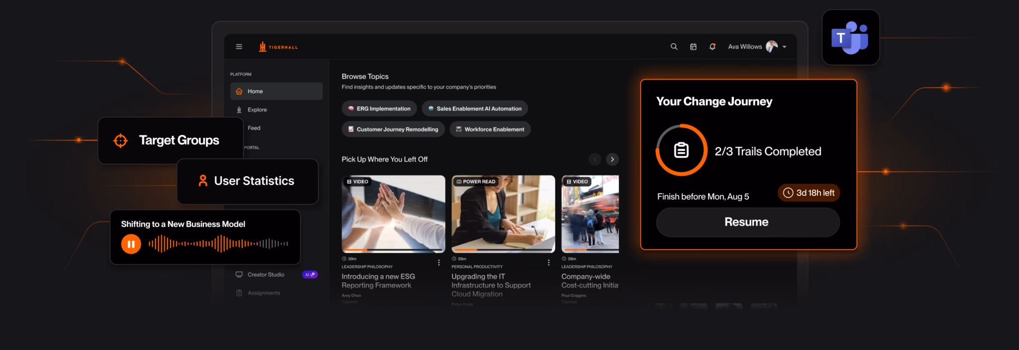 Tigerhall is an AI-powered Change Activation Platform designed to help organizations drive transformation at scale. It automates change communications, personalizes employee journeys, and integrates with existing systems to streamline adoption. With real-time analytics, sentiment tracking, and multilingual support, Tigerhall empowers change leaders to align teams, reduce resistance, and prove business impact.