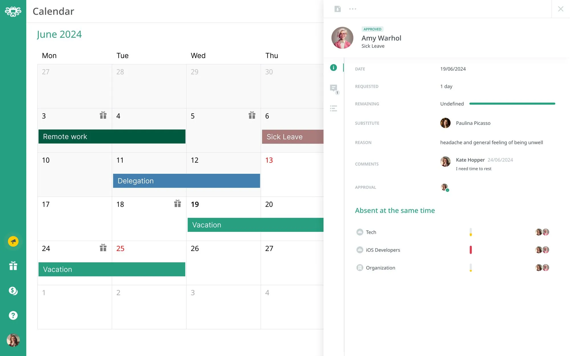 - Handles various absence types (PTO, sick leave, remote work, etc.)