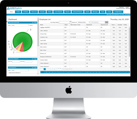 Easy to use self-service solutions keep employees engaged in time and attendance tracking. The web portal makes it easy for employees to view their time cards, request time off, and more. Employees can view their time sheet and their weekly schedule, check accrual balance, review their point balance, see the total time worked in the pay period, and run a time sheet report. A monthly calendar view provides an at-a-glance view of who has requested off on certain days so employees can check work shift coverage before requesting time off. Employees can electronically request time off. Requests are submitted to the supervisor via email and also appear on the supervisor’s dashboard. Once approved, the time off request appears on the calendar view and the employee’s timesheet, and the employee receives email confirmation when the request has been processed.
