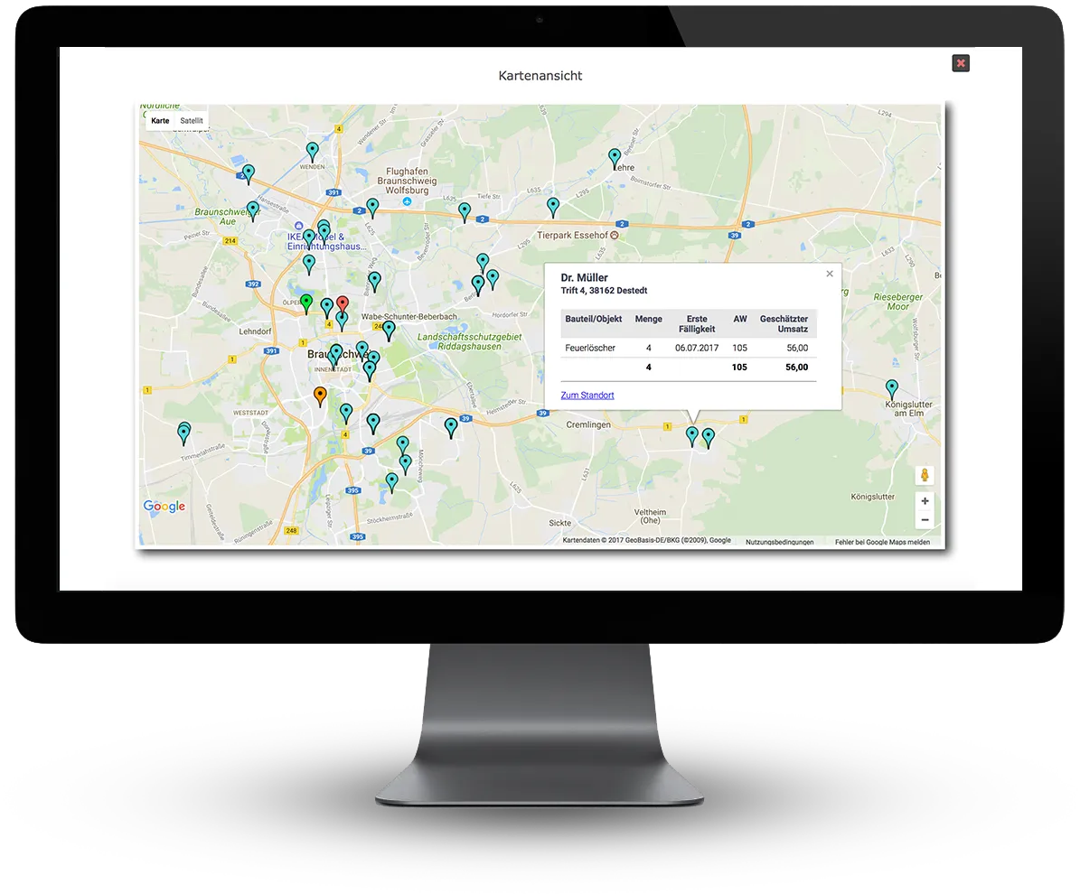 Calculation of due dates for servicing and testing, resource planning on the basis of labour requirements, map-based visualisation, extensive selection options, appointments calendar, generation of work orders.