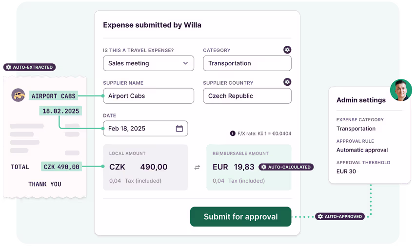 Reduce expense processing time by 80% Employees upload receipts, details auto-fill, and expenses are sent for approval in seconds.