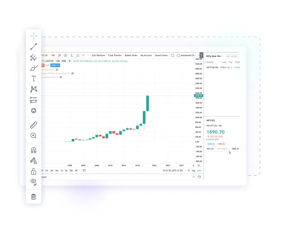 FYERS Trader is a web-based trading platform built on the TradingView charting library, aimed at active retail and professional traders. It combines high-quality interactive charts, deep historical end-of-day and intraday data, a range of chart indicators and drawing tools, price-ladder (depth) visualization, and multiple fast order-placement paths to support rapid execution and chart-driven trading workflows. The platform targets traders who prioritise advanced technical analysis, low-latency order entry and tools such as watchlists, option chains and historical data for backtesting and analysis.