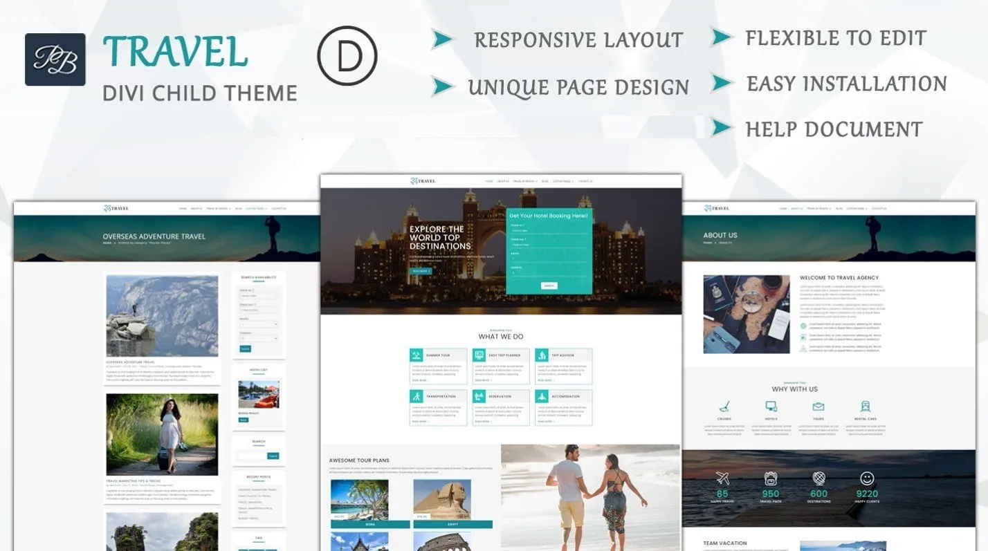Travel is modern and elegant Multi Page Divi Child Theme which is suitable for travel, travel agency, travel guide, holiday, vacation, tourism, hotel booking, tour, travel packages, trip, hotels and resorts categories.