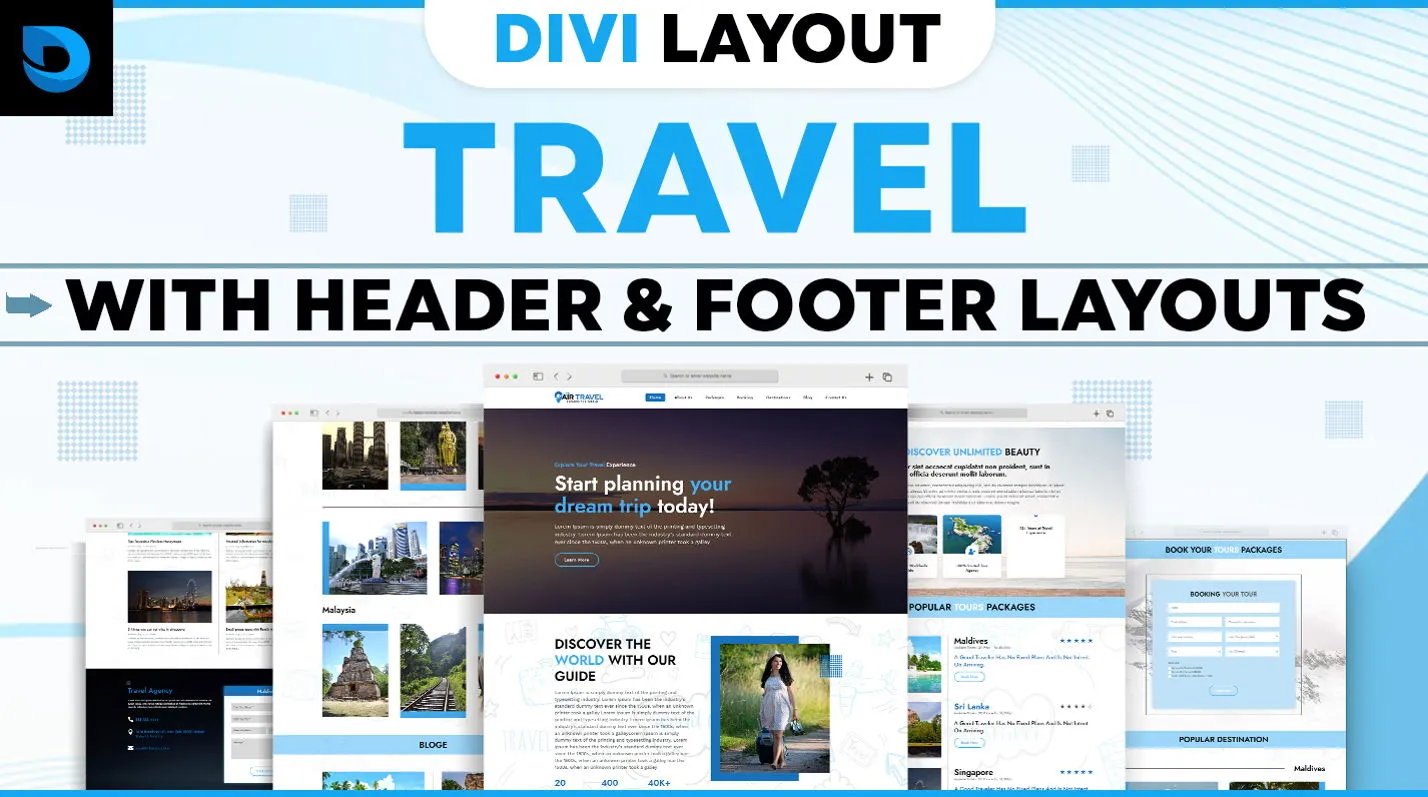 Divi layout pack for travel websites—includes 8 stylish pages for showcasing destinations, packages, blogs, and contact info.
