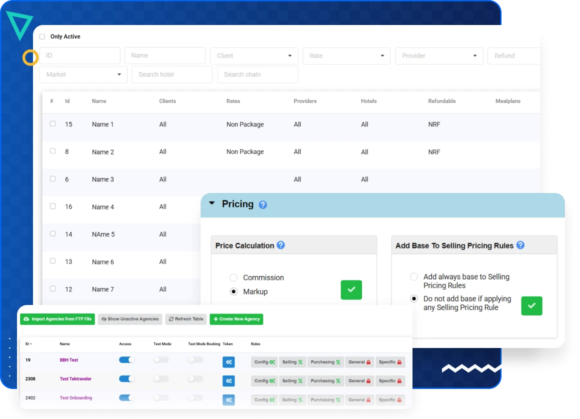 - Manage pricing rules, filters, and blacklists for each of their buyers connected through Travelgate.