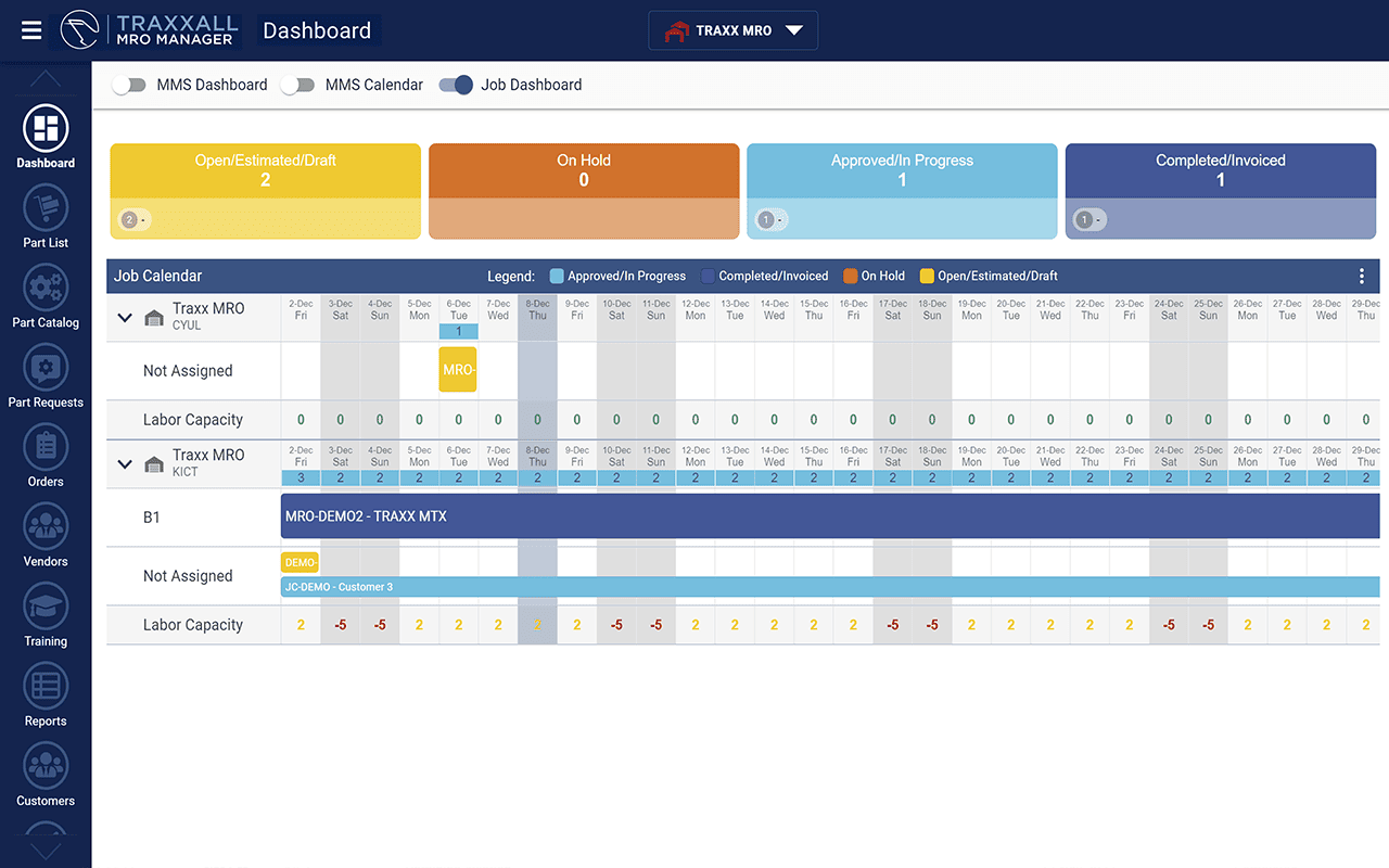 Traxxall MRO Manager is a cloud-based software solution designed to streamline aircraft maintenance operations. Built on the foundation of Traxxall’s comprehensive maintenance tracking platform, it provides full visibility into ongoing projects, resource allocation, labor costs, material management, and invoice generation. The system is tailored for aviation professionals seeking operational efficiency and seamless integration with existing systems.