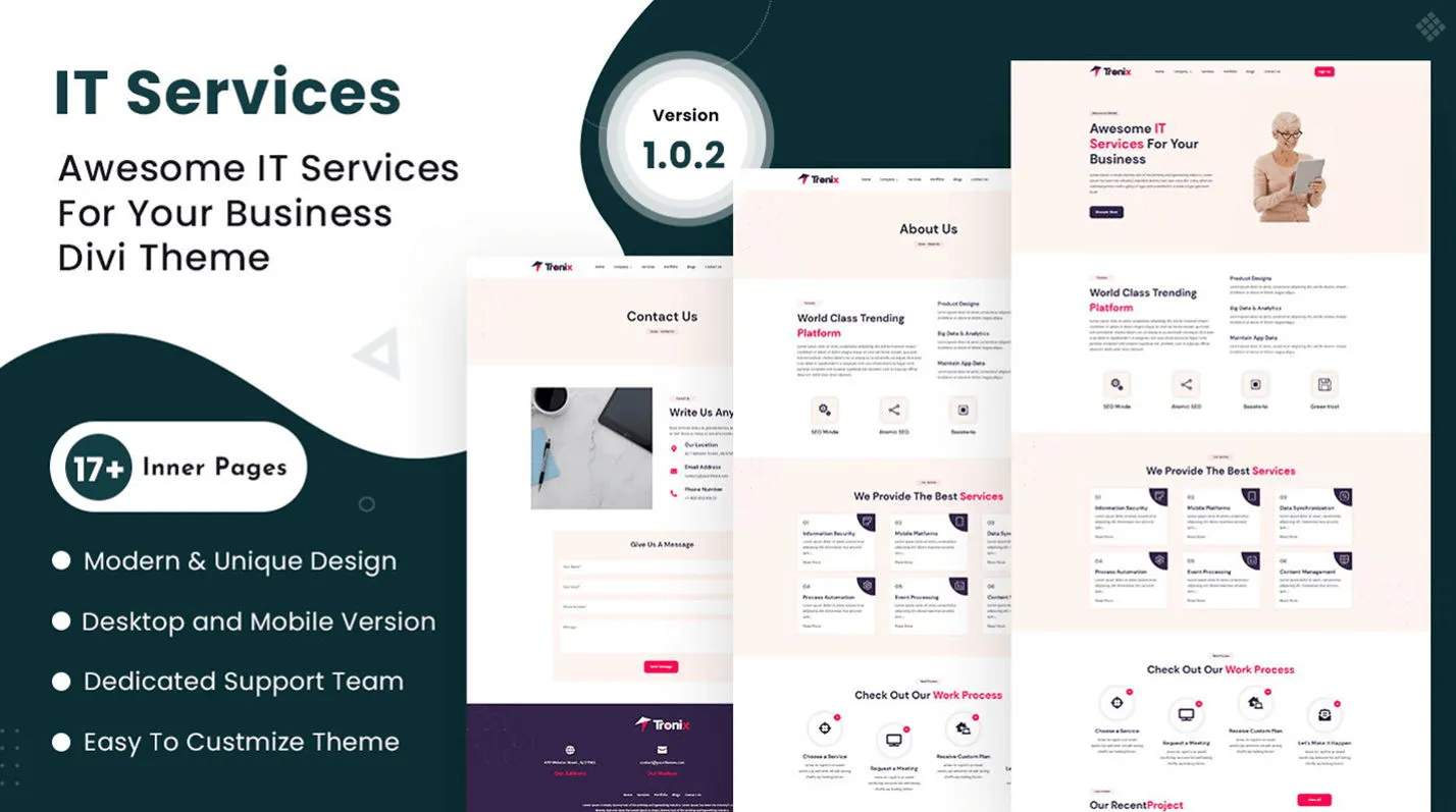 Modern Divi child theme for IT services with service pages, contact forms, and sleek corporate design.
