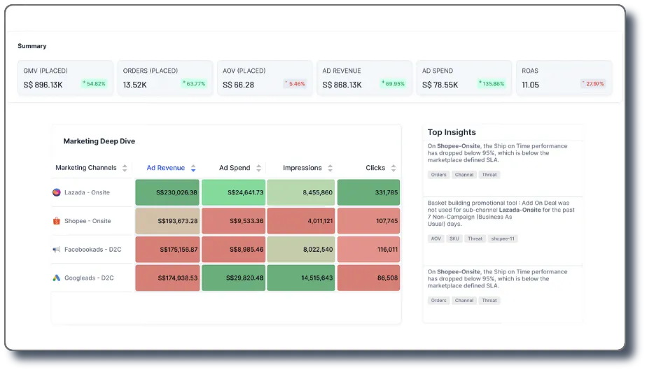 - Unified Data Platform: Integrates sales, ads, and SKU data from D2C, marketplaces, and ad channels into a single source of truth.