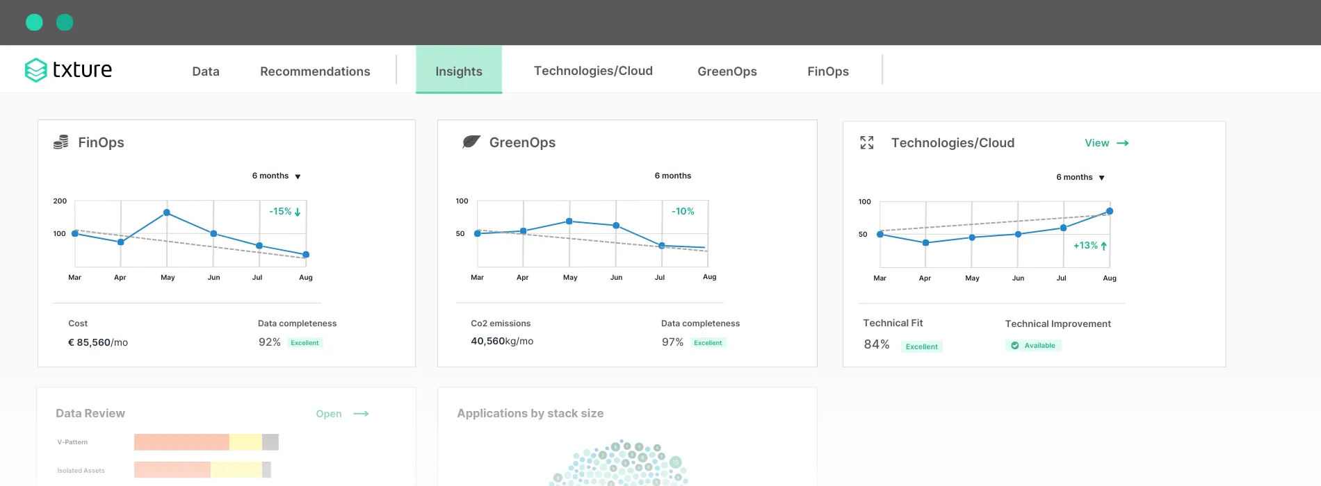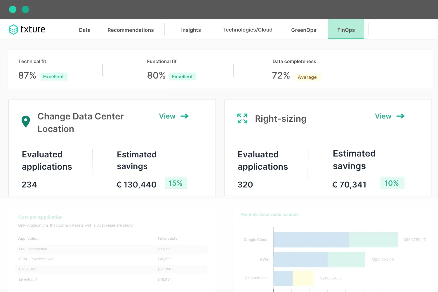 Txture’s SaaS platform provides a transparent overview of your cloud application portfolio, and automatically shows you how to maximize its value through cost optimization, GreenOps and strategic application modernization.