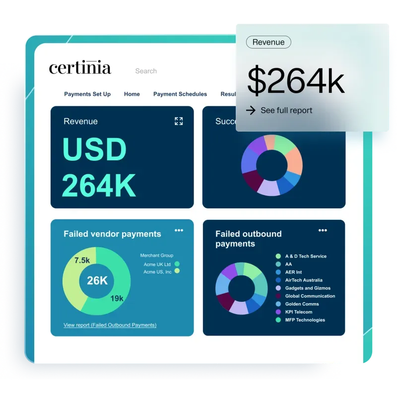 Add multiple payment methods and keep track of inbound payments across multiple PSPs on a single platform. With all your payments data securely stored in Certinia, you can report, audit and forecast with pinpoint accuracy, helping you make better decisions.