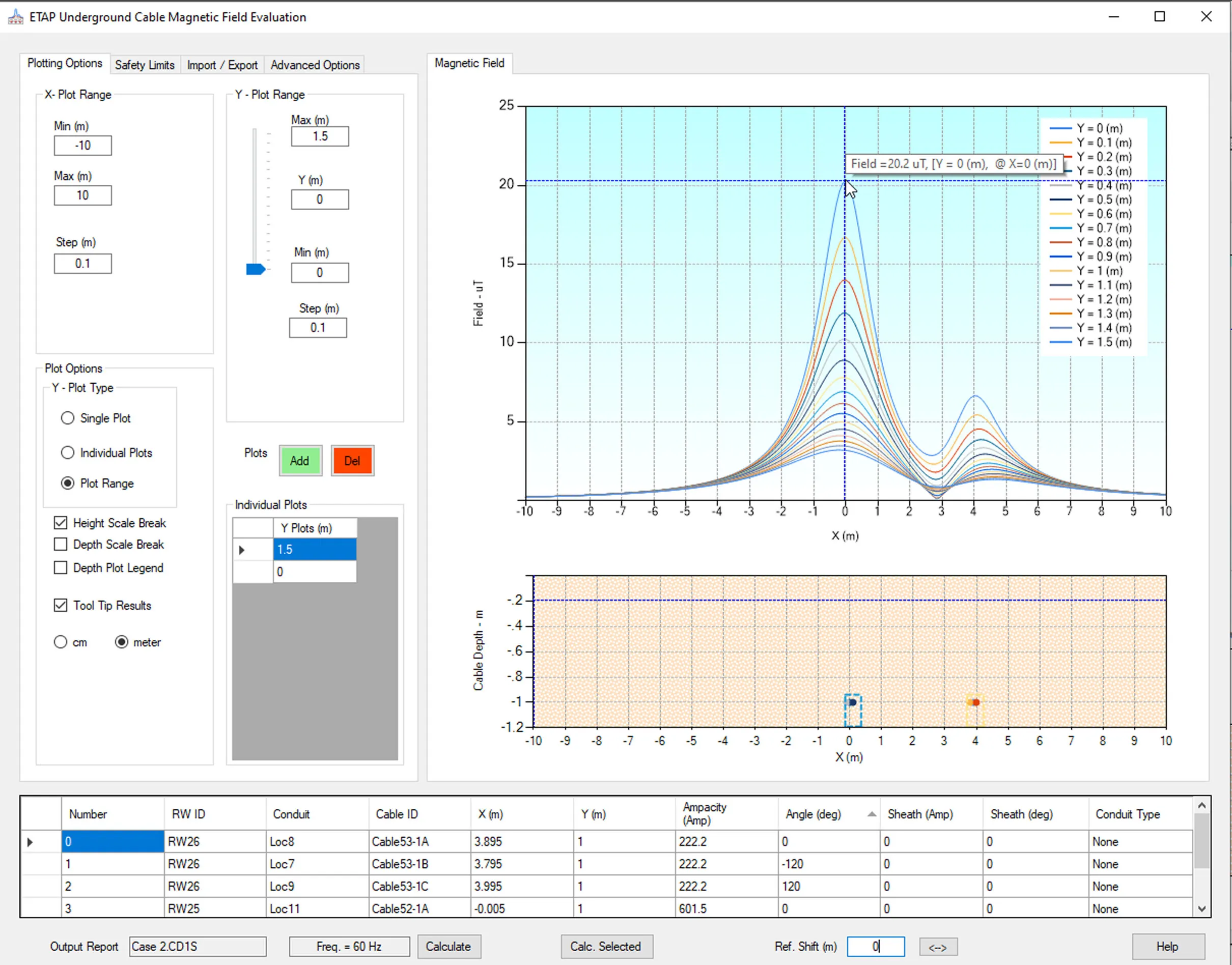 The magnetic field exposure analysis tool is integrated with the underground cable systems (UGS) analysis module, and it determines the worst-case magnetic fields produced by conductors in underground raceways. The tool handles various 3-phase conductor layouts including flat and trefoil as well 1/C and 3/C 1-phase cables, dc cables, etc. The tool uses balanced & unbalanced load-flow currents and angles to determine the location and surface-level height of the worst-case magnetic field because of all conductors in the raceway.