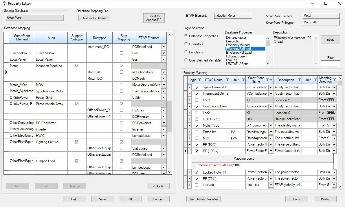 Flexible database mapping module to transform and manipulate data between ETAP and other databases