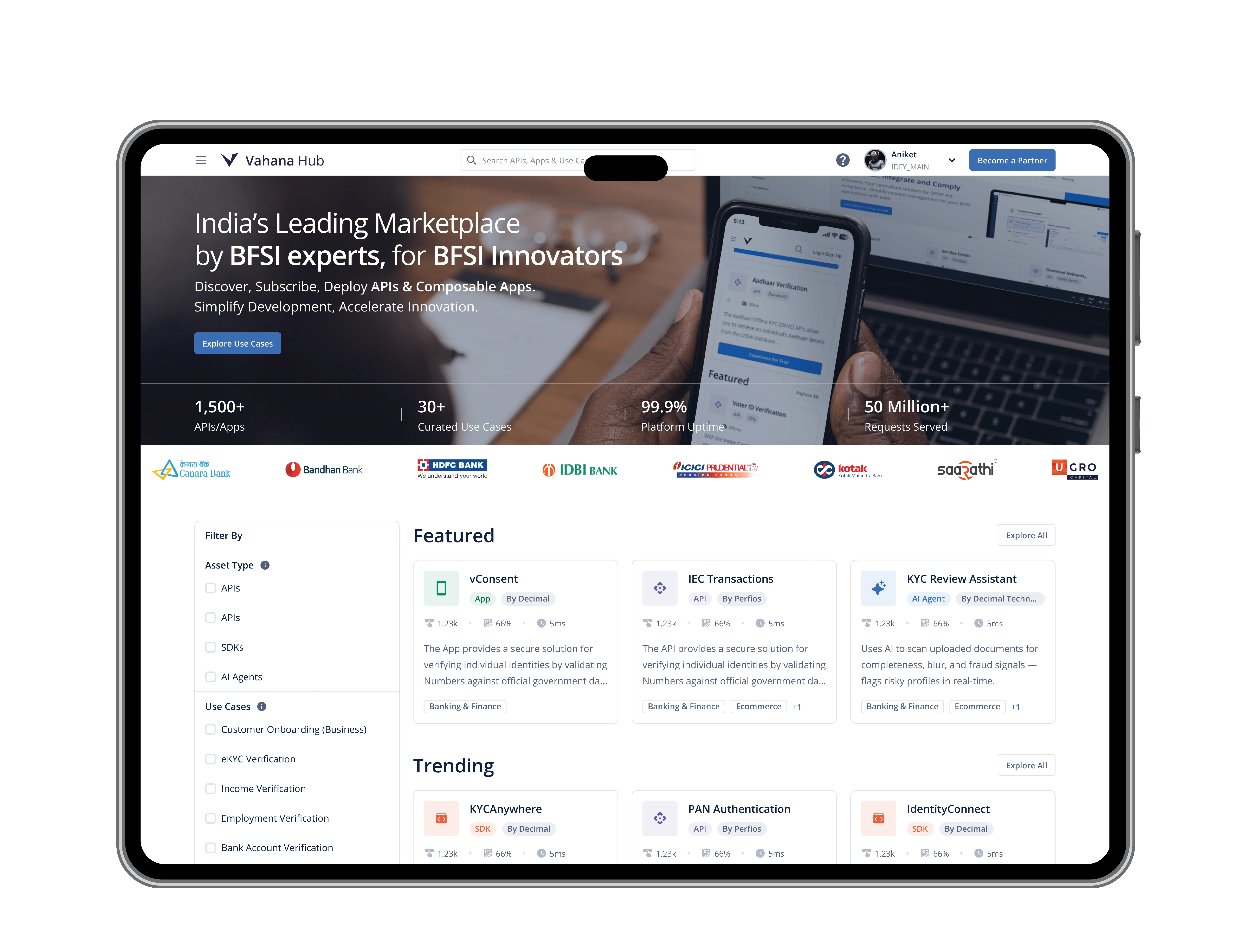 Vahana Hub is an API marketplace enabling businesses to discover, test, and consume over 1500 APIs from 70+ partners, facilitating Open Banking and digital transformation.