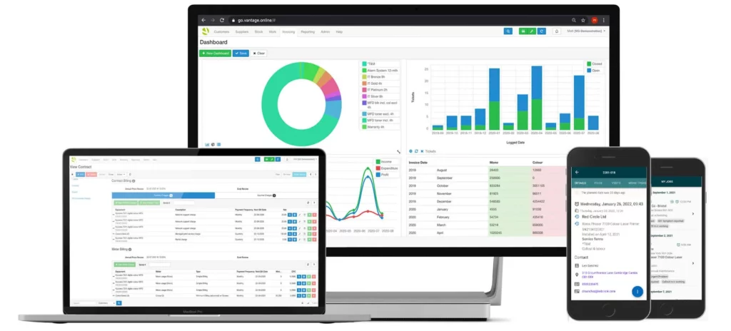 Vantage Online seamlessly connects your office, engineers, and clients. Devices are managed, jobs completed, and invoices issued—all within a single, intuitive platform.