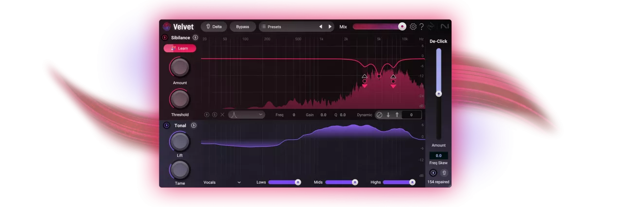 Packed with features to help you dial in your sound, Velvet makes it simple to take vocals from raw to flawless. Soften sibilance and dynamically shape tone with intelligently split Sibilance and Tonal channels. Instantly identify sibilant frequencies with Sibilance Learn, and precisely remove distracting mouth sounds, pops, and clicks with De-Click.