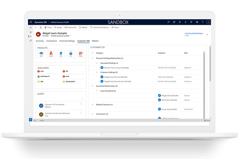 - This view also provides a 720-degree view of the customer’s relationship with other individuals that have a relationship with the bank. Customers can be connected to each other through different financial products or through household or other types of relationships.