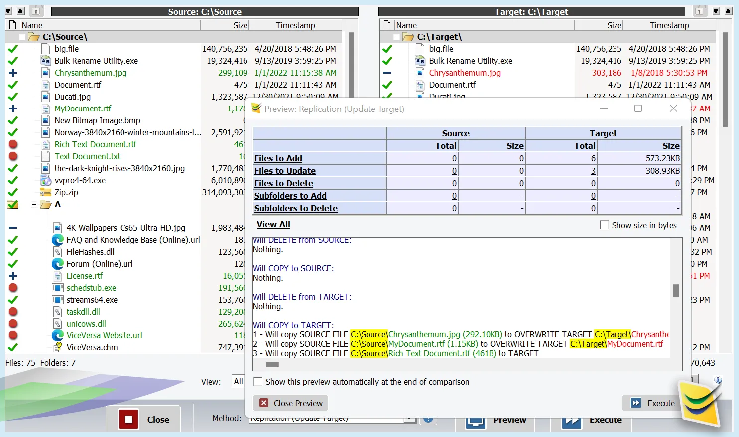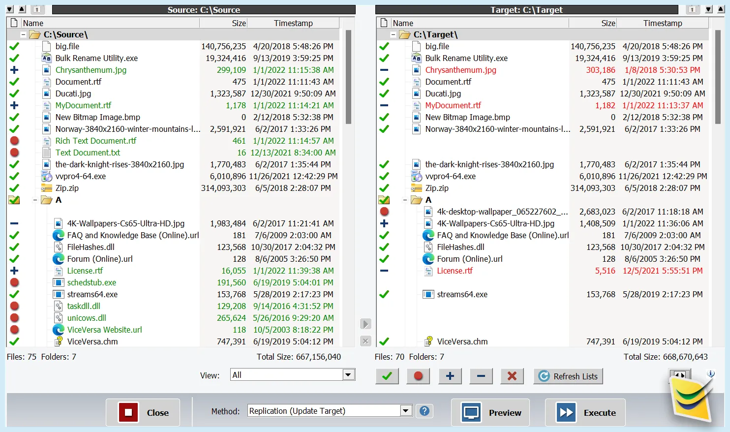 Compare files side-by-side: ViceVersa shows you which files are different, newer, older or the same on both sides.