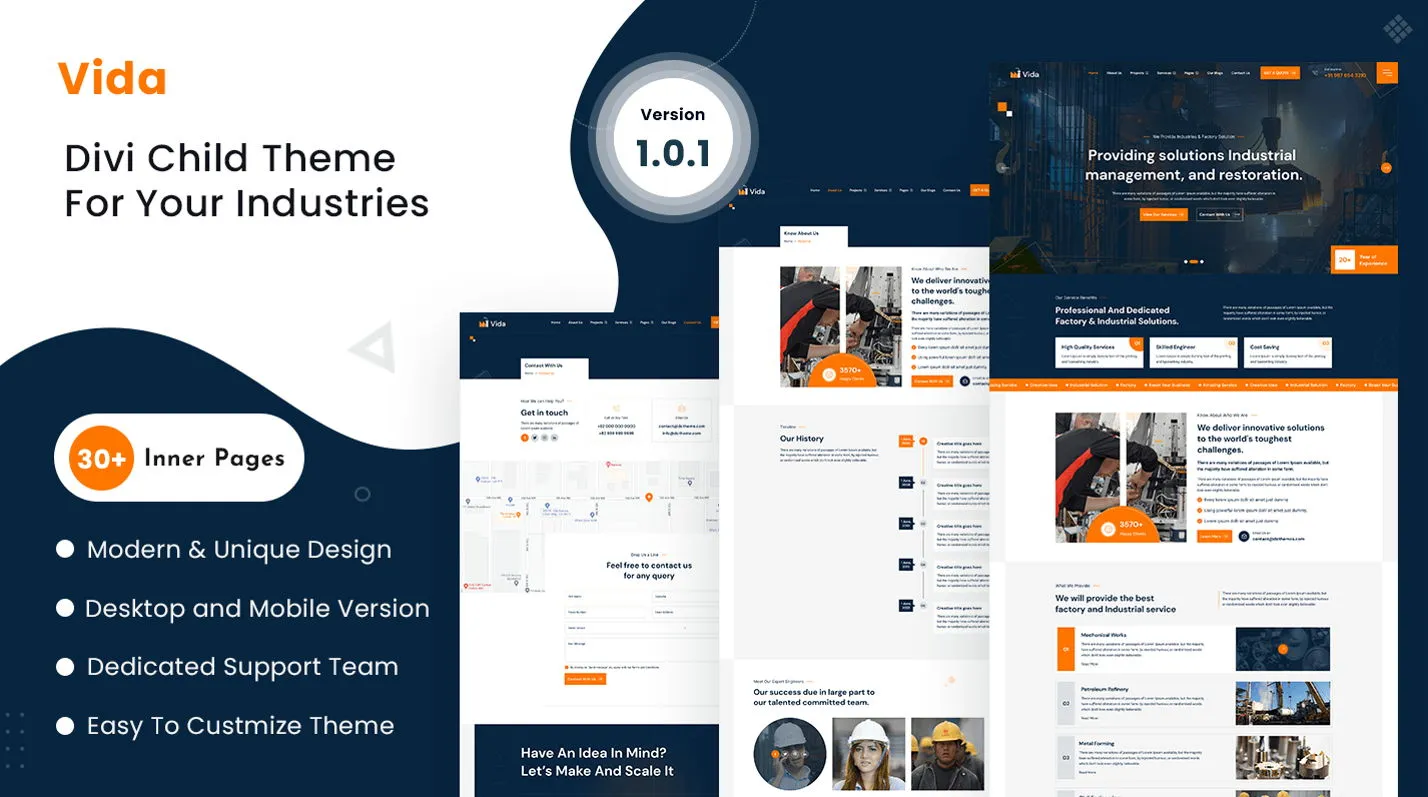 Vida is a robust Divi child theme for industrial and factory websites—clean, responsive, and easy to customize.