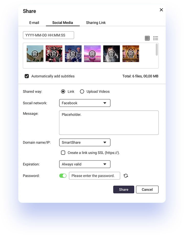 Share your videos and movies via email, social networking sites, or sharing links.