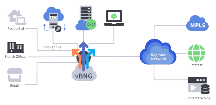 The 6WIND Virtual Broadband Network Gateway (vBNG) is a high-performance, cloud-native solution designed for broadband subscriber management and aggregation. It enables service providers and network operators to efficiently scale bandwidth, manage millions of sessions, and introduce new services rapidly, all while reducing operational risks and costs.