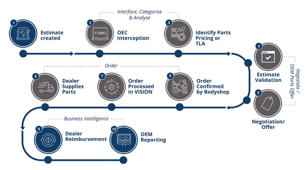 VISION and CollisionLink Broker connect crash repairers directly with vehicle manufacturers and dealers, notifying the manufacturers’ central sales teams when a collision estimate is written. The specially-designed software from OEC boosts your vision of the market for more effective and efficient parts sales.