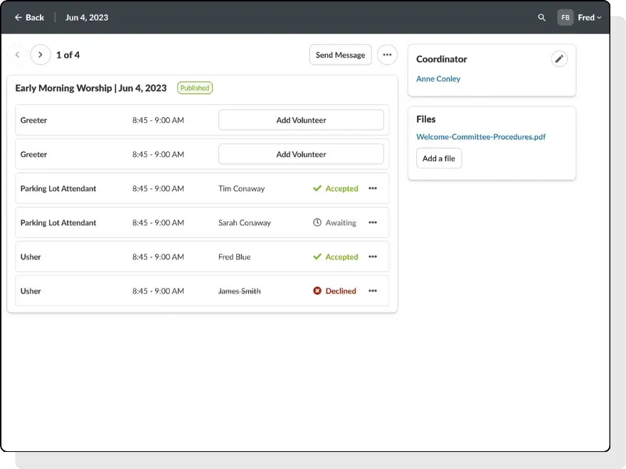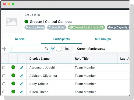 Once you have volunteers recruited, you need a way to manage them and communicate with them. Organize your volunteer teams into groups associated with the appropriate events, and use Volunteer Connect to manage and schedule volunteers to serve.