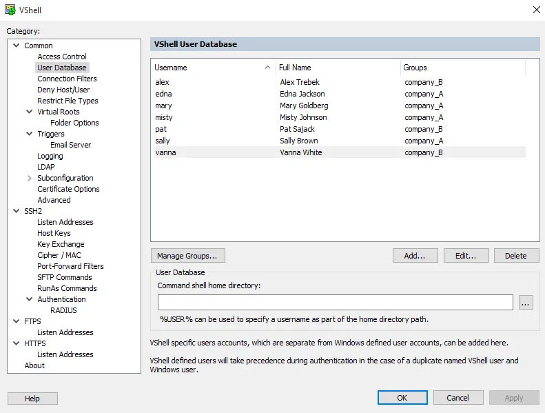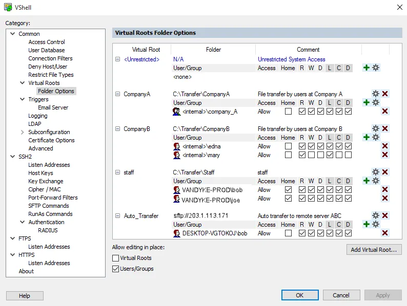 - Define which services — SFTP, SCP, FTPS, FTP, HTTPS, HTTP, shell, port forwarding — are granted to users or groups with VShell Access Control Lists (ACLs).