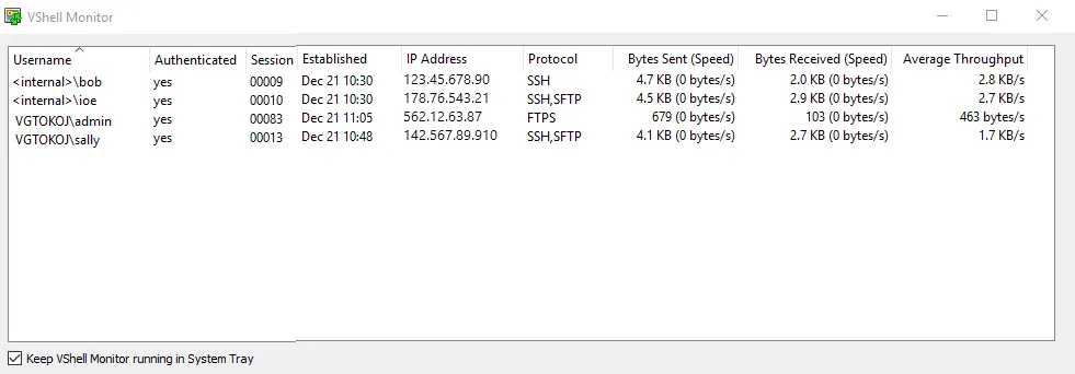VShell Monitor is a real-time connection monitoring tool that allows an administrator to view active connections to the VShell server.
