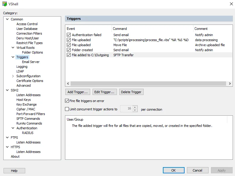 - VShell triggers allow you to automatically track and respond to events like file uploads, downloads, and failed logon attempts.