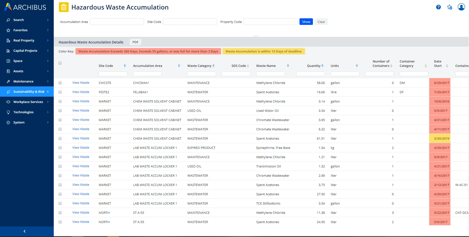 Managing waste streams, particularly hazardous waste, is often fraught with risk and possible negative outcomes, if handled poorly. Organizations need not only to cope with the often burdensome regulatory paperwork, but also to avoid the risk of errors, omissions, and accidents that can lead to injuries, penalties and/or potential litigation. Web-based Archibus Waste provides a streamlined and integrated approach to tracking, managing, and reducing both hazardous and non-hazardous waste. It helps smoothly process the information flow, starting from the point of generation, through accumulation, storage, shipment or emission, and final disposition. And it provides defensible information to assess the effectiveness of waste reduction and recycling programs that, in turn, help reduce carbon footprint and increase LEED™ or other sustainability scores.