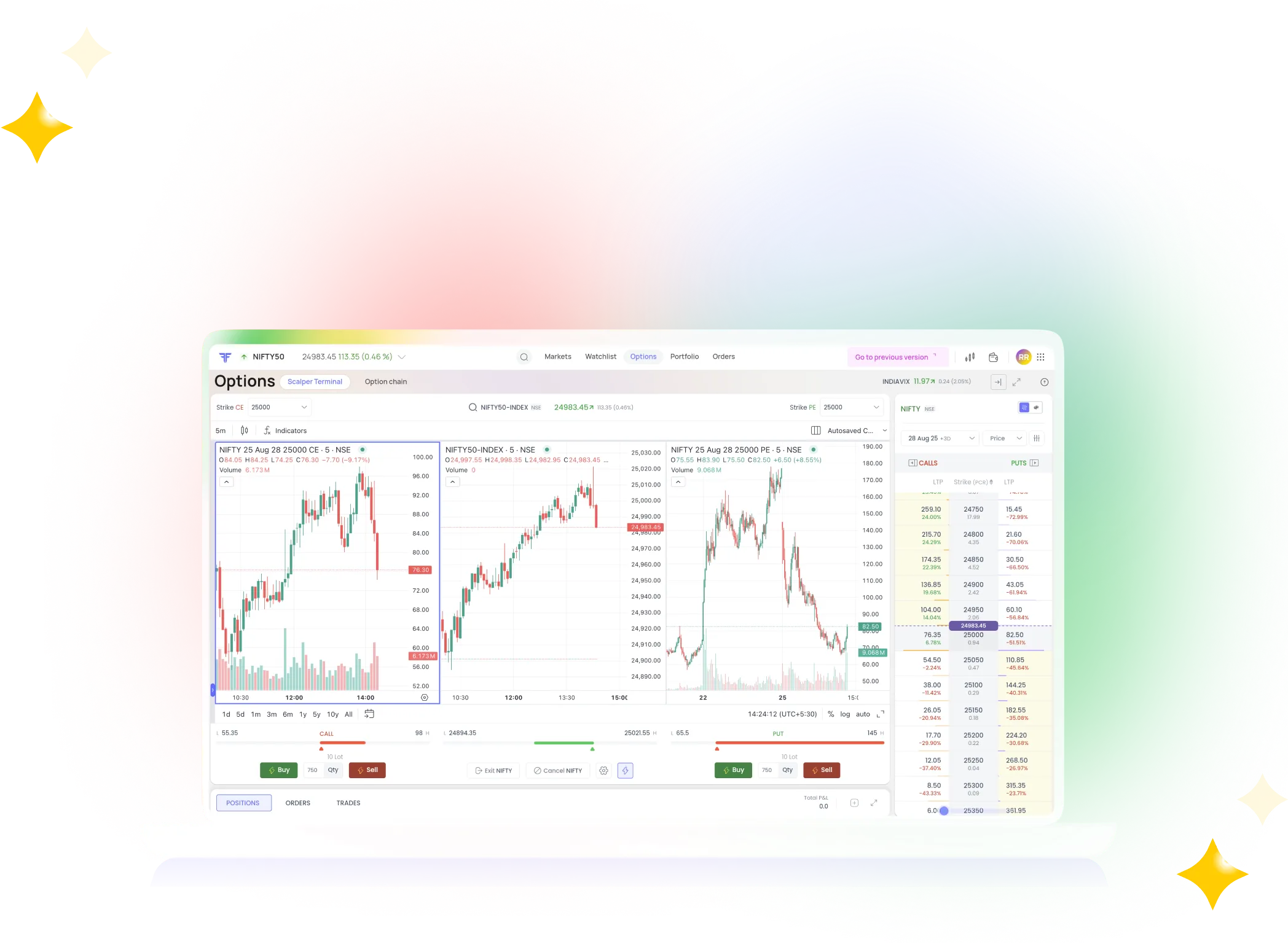 - Scalper Terminal: Specialized options scalping terminal with 3-in-1 charts, options chain view, market depth, and quick trade entry features aimed at high-speed traders.