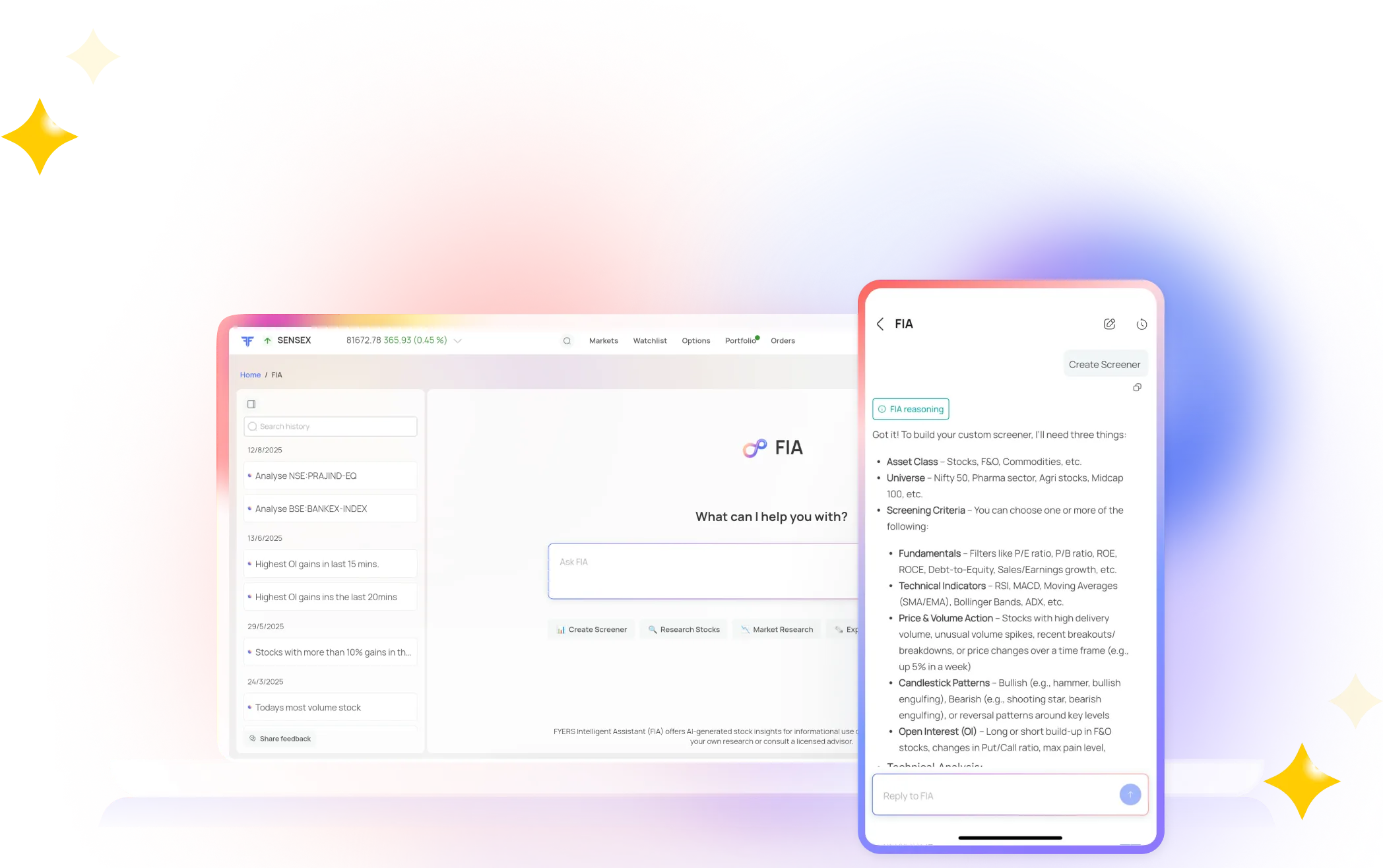 FYERS Web & App is an all-in-one trading and investment platform designed for retail and professional traders in India. It combines real-time market data, advanced charting with TradingView integration, AI assistance (FIA), multiple order types, and specialized tools such as a Scalper Terminal and Smart Orders. The product supports equities, derivatives, commodities, and mutual funds, and aims to deliver fast execution, multi-layout charts, and cloud-based features for on-the-go trading across web and mobile.
