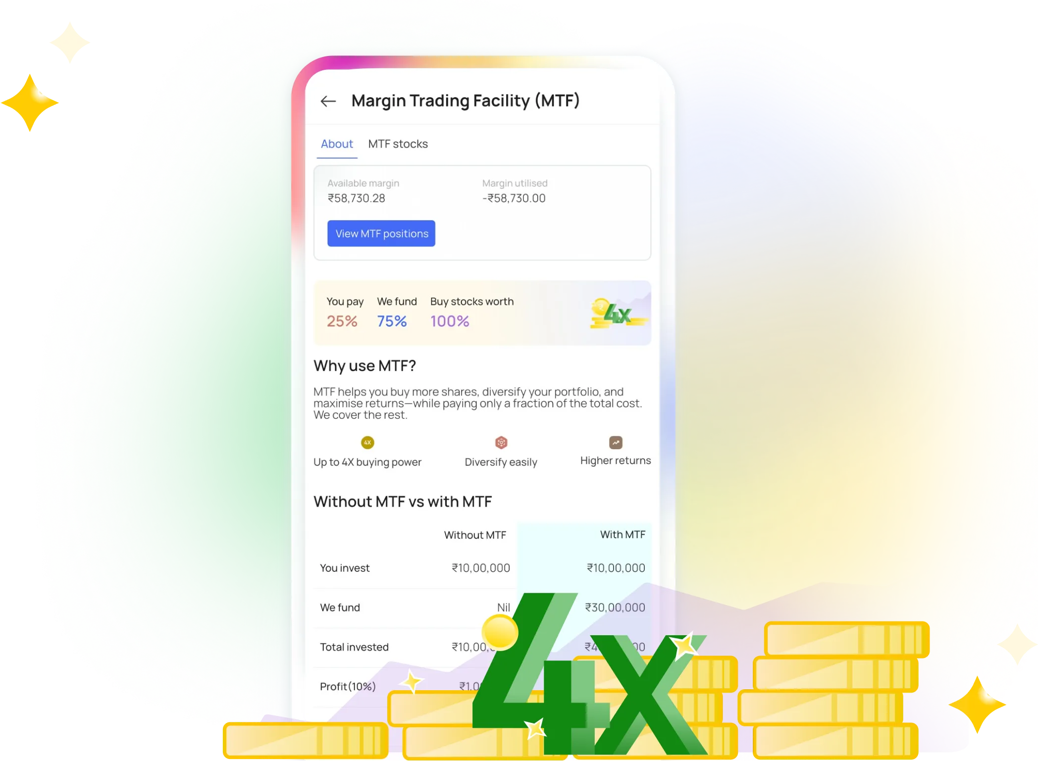 - Margin & Leverage: Margin Trading Facility (MTF) support to access additional leverage on delivery trades with guided activation workflows.