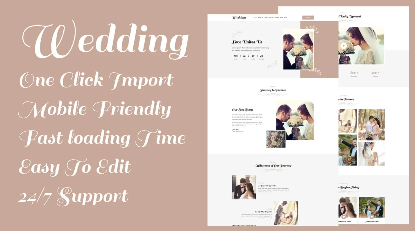 - Pre-Built Pages: Includes homepage, RSVP, gallery, event details, and contact.