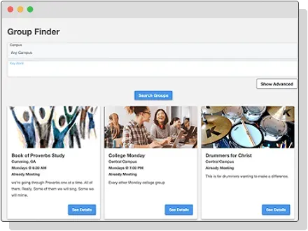 Groups enable your members to connect and build relationships outside of worship service. The Group Finder widget allows members to view available groups and group details and sign up for those that interest them. The My Groups widget allows users to view the groups in which they currently participate.