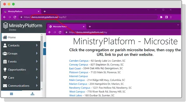 Widgets provide a way to integrate MinistryPlatform functionality directly into your website. This allows members to easily access important information, connect with groups, register for events, submit requests, and more, all within a seamless user experience on your existing website. Widgets are configurable tools designed to enhance member engagement and streamline ministry processes. Microsites provide similar functionality without the configuration by adding a URL link to your website.