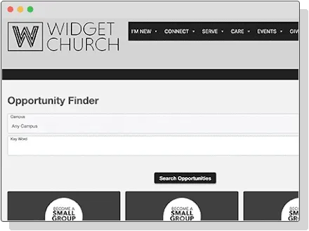 Opportunities help your people get plugged in to serve. Publish open opportunities using the opportunity widgets to show all the possibilities for volunteering and allow your members to make sure they find a good fit to serve.