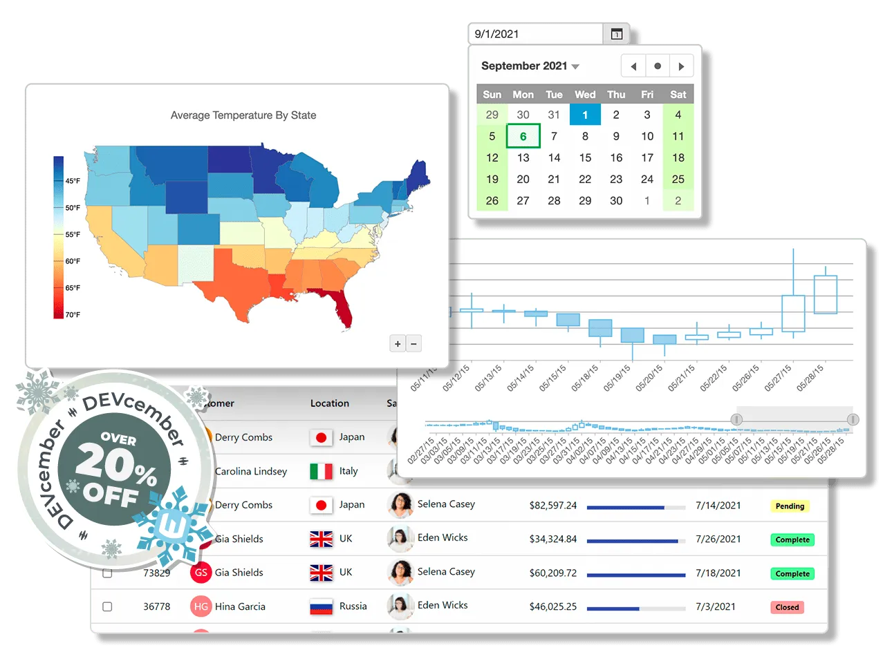 - Input controls: Auto-complete, date/time pickers, color pickers, masks, menus, and multi-selects.