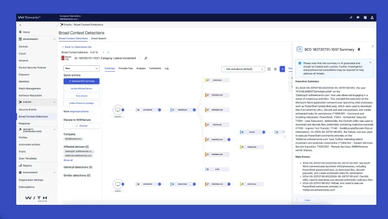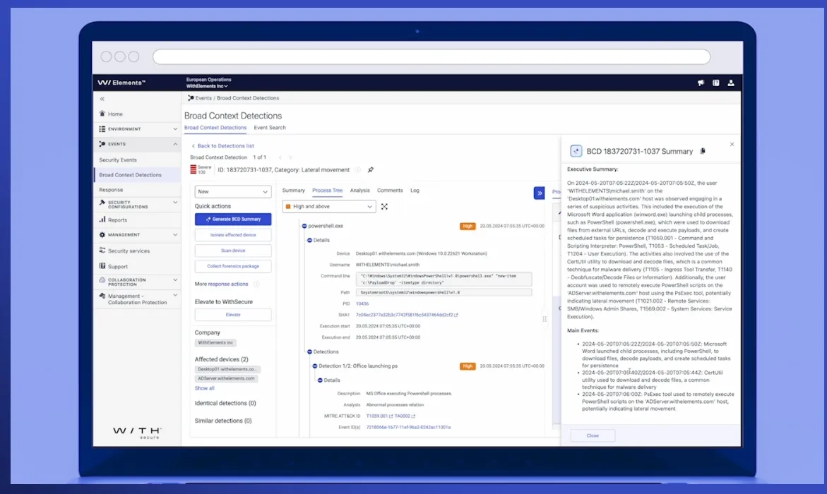 Luminen™ GenAI analyses and provides natural language explanations of all Broad Context Detection™ (BCD) from WithSecure Elements XDR, enriched with relevant external threat intelligence data. It empowers IT teams by immediately assisting users of any experience level to better understand the context and impact of BCDs, allowing them to focus on what matters most. With Luminen™, users of Elements gain access to the same powerful Generative AI capabilities that WithSecure’s™ threat hunters use to efficiently and effectively deliver 24/7 human-led detection and response. Luminen™ never replaces humans, it just gives them superpowers.