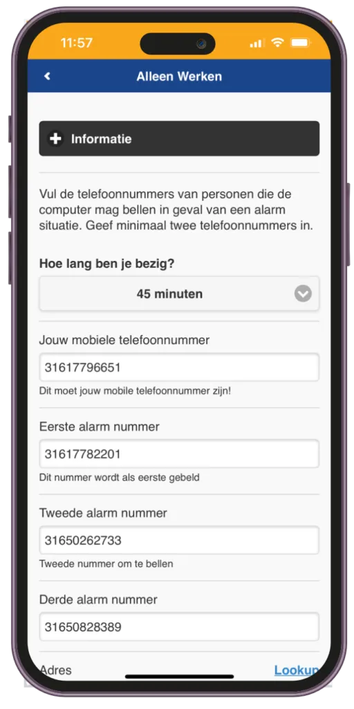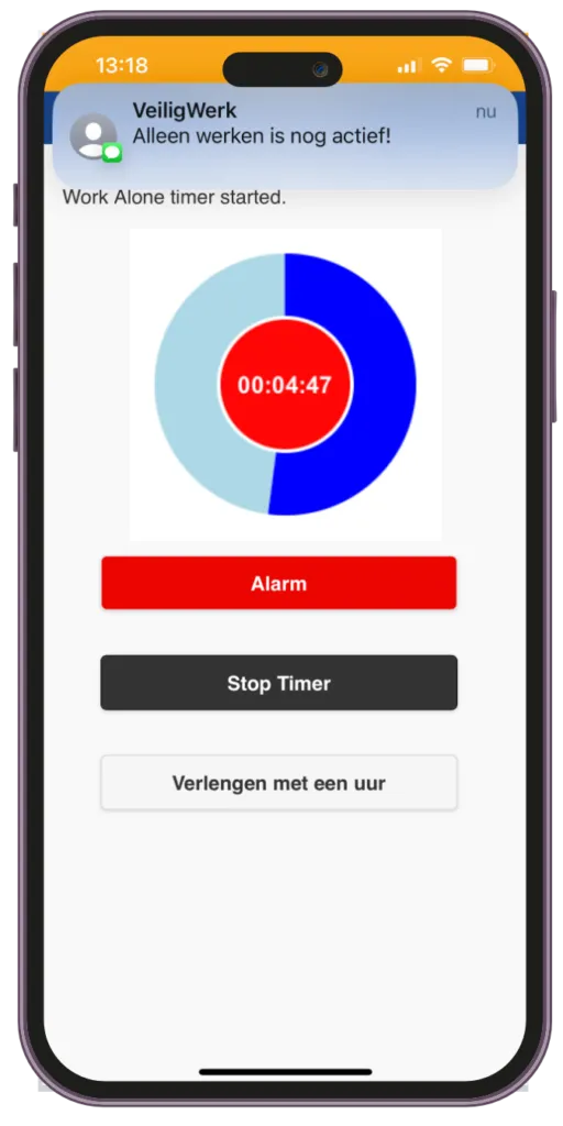 The "Work Alone" module is designed to increase safety for employees who perform high-risk work alone. This module is ideal for mechanics, electricians, technical employees, inspectors, and others who may find themselves working in isolated or hazardous conditions. By allowing users to set a work duration and emergency contacts, the module ensures that help is alerted if the user does not log out in time or presses the alarm button.